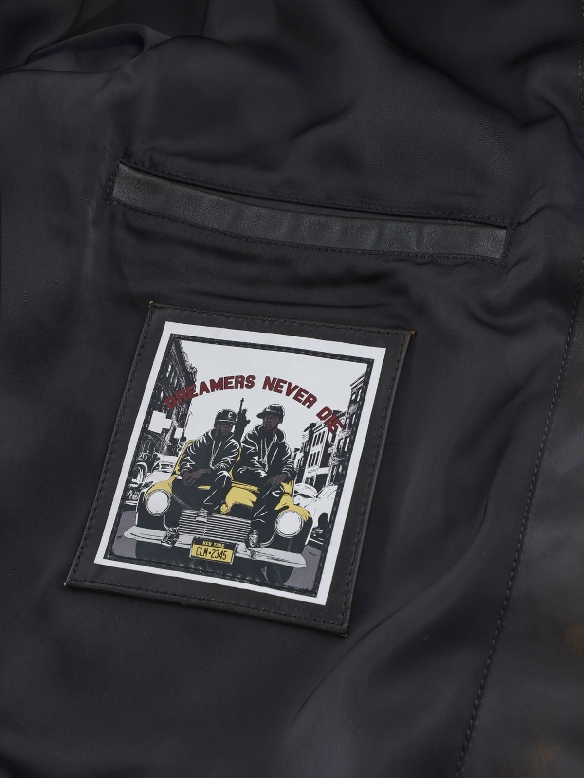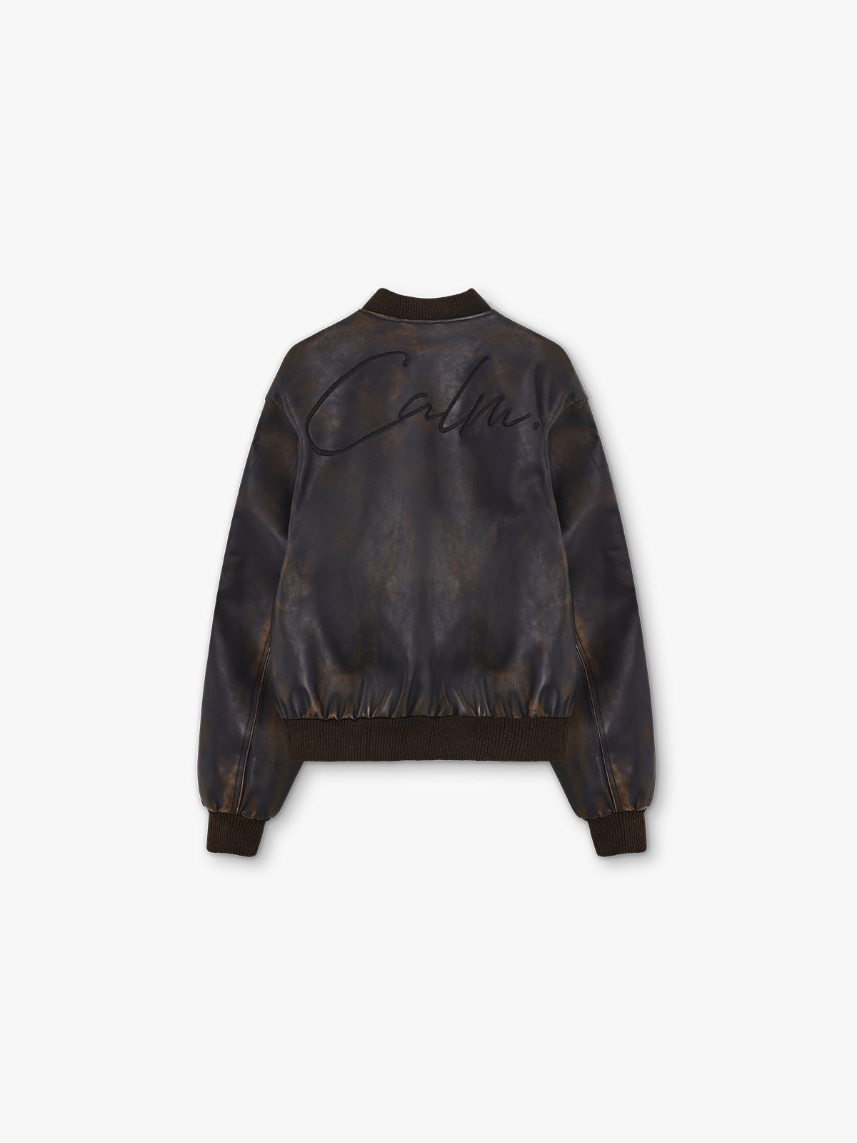 Varsity Jacket made in a thick washed leather. Featuring the iconic calm. logo script embroidered on the back, cow pattern plush inside.