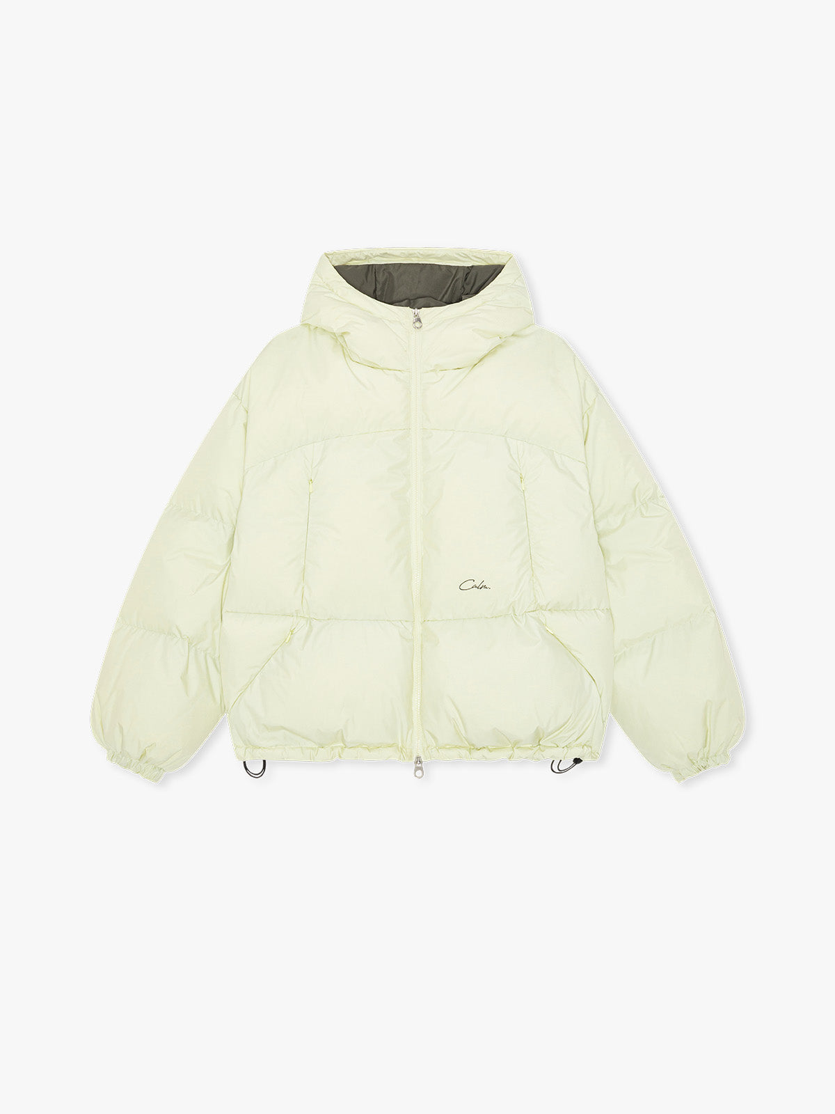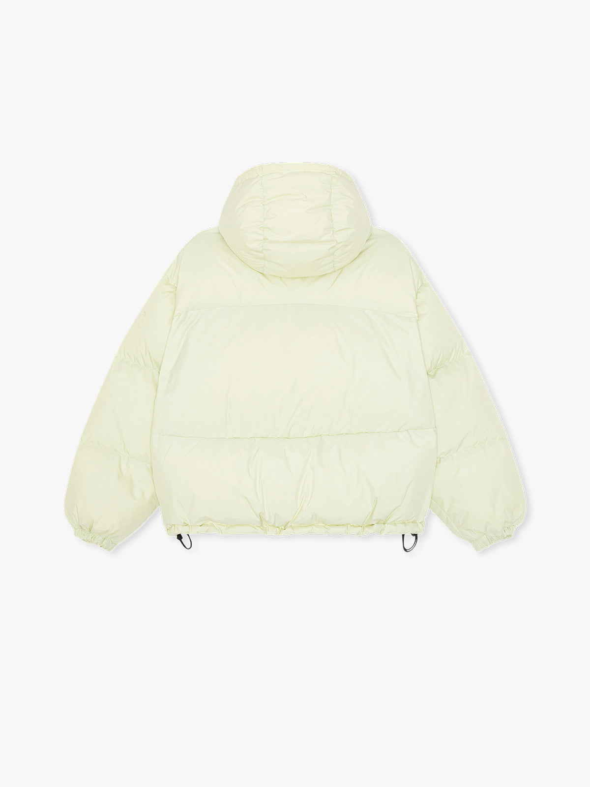 The Puffer is built in a ripstop shell with a soft natural filling for warmth and everyday use. The jacket has a relaxed shape with a full zip closure, fixed hood and elastic cuffs. The hem includes adjustable drawcords for shaping. Two hidden side pockets are placed along the front seams and a rubber print Calm logo sits on the chest
