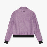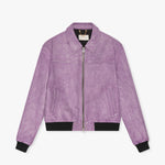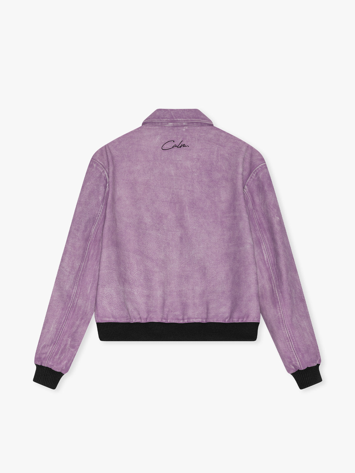 Heavy Hitter Leather Jacket made in a washed purple leather. Featuring the iconic calm. script logo embroidered in black on the back.