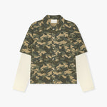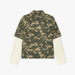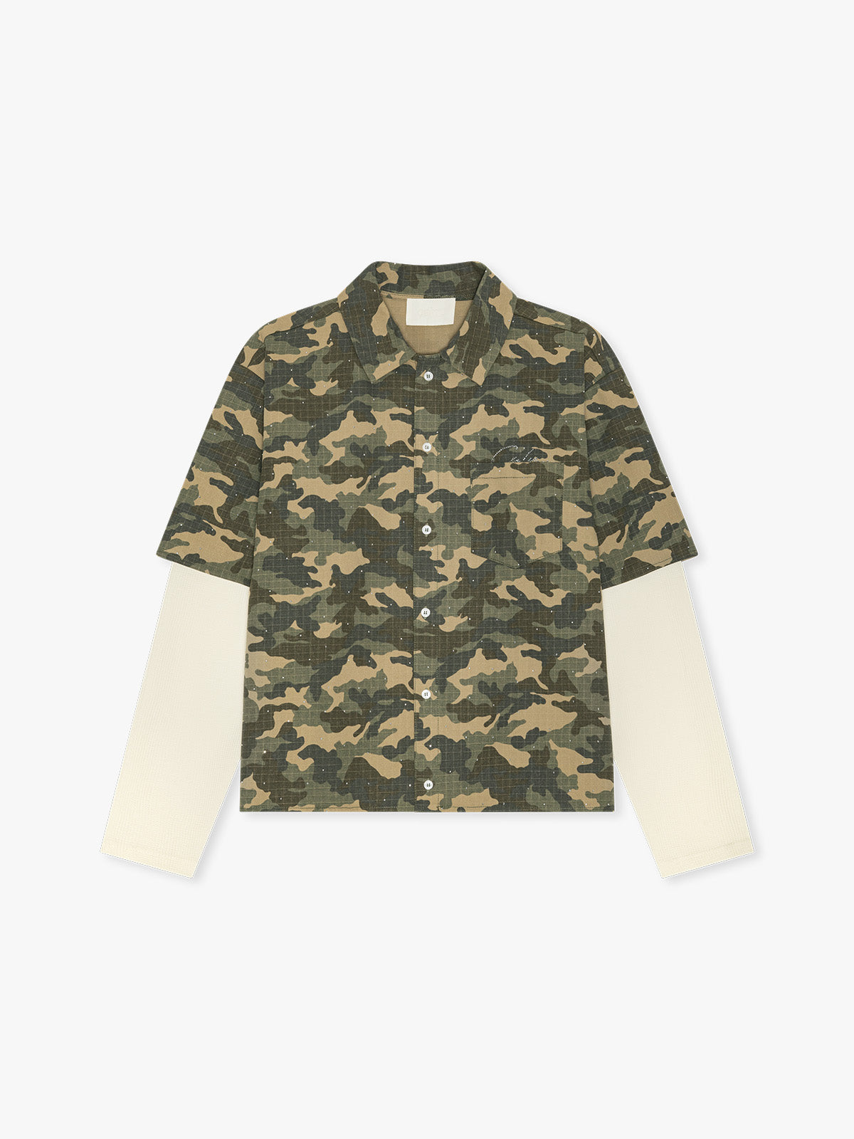 Introducing our Hybrid Flannel in Camo, crafted from washed ripstop cotton with contrast waffle sleeves for a layered and textured look.Designed in a relaxed fit with a short-sleeve ripstop body and long off-white waffle sleeves for depth and structure. Finished with rhinestone details and the Calm logo embroidered below the front pocket to match the Camo Ripstop Pants.