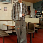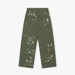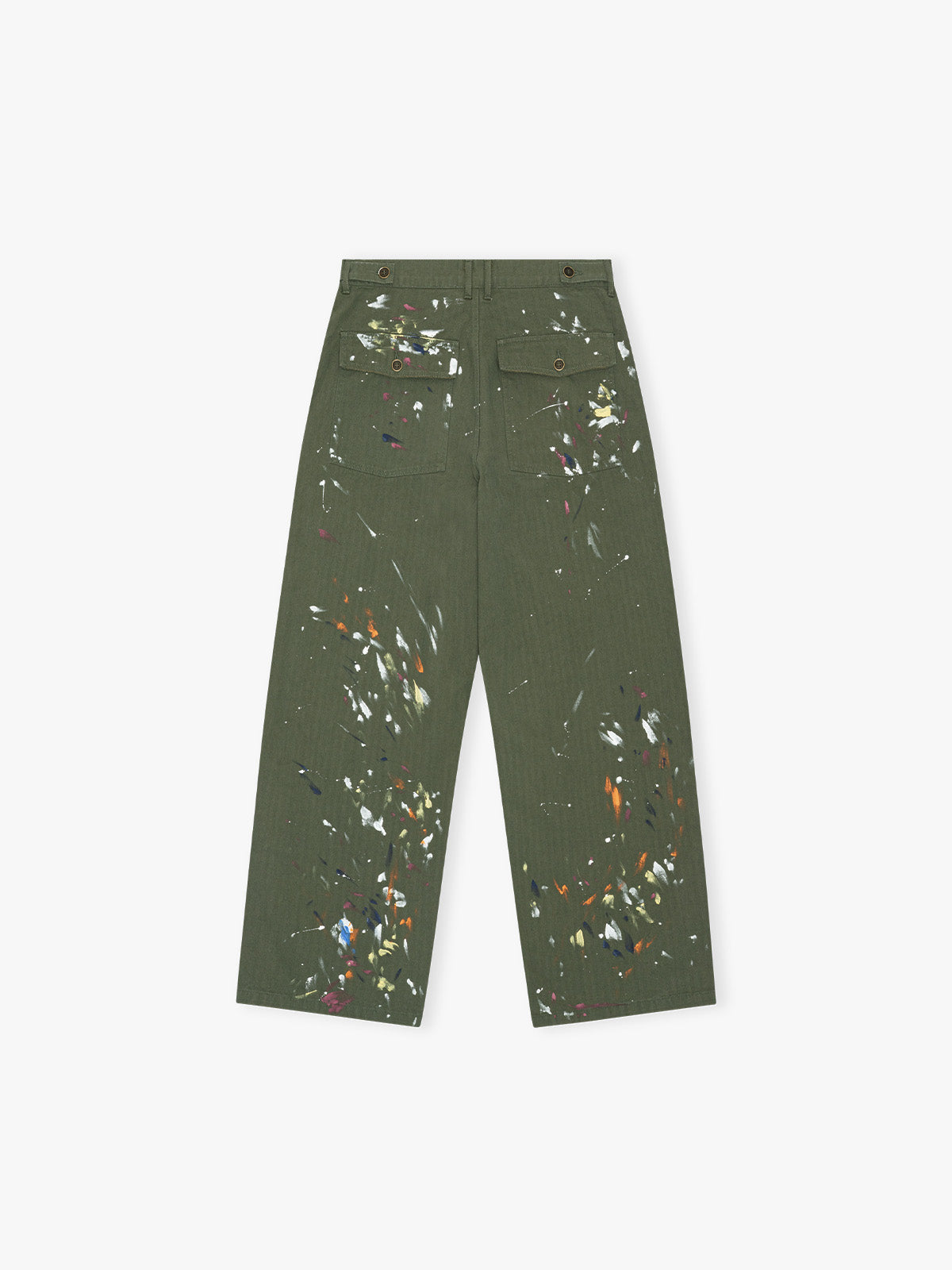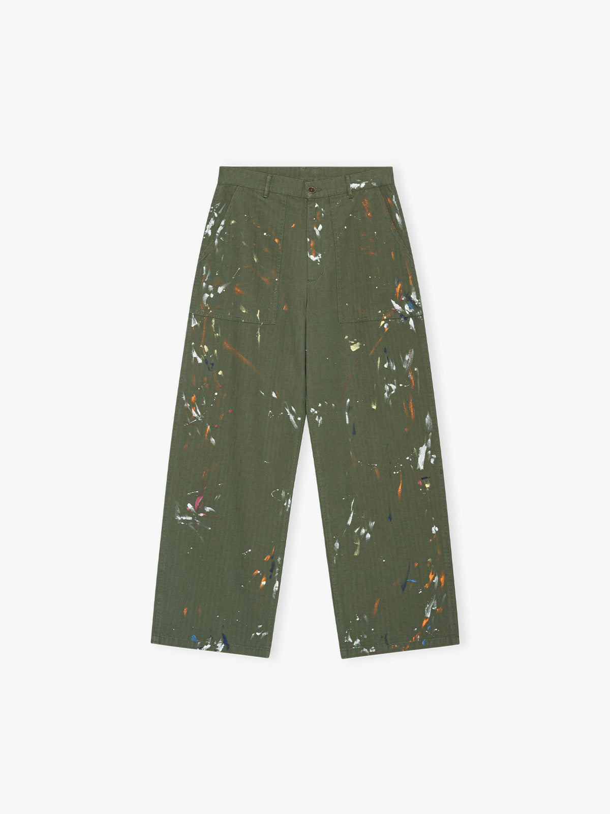 The Calm Herringbone Paint Pants are made from a durable cotton fattigue herringbone fabric with a structured feel. They have a relaxed straight fit with a classic workwear silhouette, featuring a button closure and reinforced seams for everyday wear.